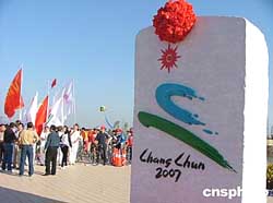 長春二零零七年第六屆亞洲冬季運動會會徽九月二十一日下午在長春市揭曉。深圳市王春濤設(shè)計的作品“飛越”最終當選為亞冬會會徽。會徽以兩個英文字母“C”組成,是跳臺滑雪的運動造型,它既代表第六屆亞冬會的舉辦國“中國”和舉辦城市“長春”,又體現(xiàn)了更高、更快、更強的奧林匹克精神。中新社記者:吳兆飛
