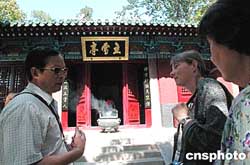 | 九月二十一日,導(dǎo)游在剛剛竣工的少林寺立雪亭前給游客講解。中國嵩山少林寺整修工程近日竣工,過去僅能容納三千多人的少林寺整修后可同時接納一萬人游覽。今年三月份,鄭州市政府開始全面對少林寺進行整修。整修內(nèi)容除包括擴建青石廣場,寺院內(nèi)地面磚、消防通道等建設(shè)外,還恢復(fù)東西八座殿堂的歷史原貌以及殿宇樓閣的重新粉飾添彩等多項工程。這次少林寺整修工程共鋪設(shè)青磚地面近一萬平方米,恢復(fù)建筑面積一千六百平方米,新建東僧房建筑面積近一千五百平方米。作者:慎重
