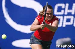 九月二十二日,中國網(wǎng)球公開賽的WTA賽事的女單比賽繼續(xù)進(jìn)行,在北京網(wǎng)球中心中央球場進(jìn)行的一場引人注目的女單比賽中,三號種子俄羅斯選手莎拉波娃輕松戰(zhàn)勝另一名俄羅斯選手的帕諾娃,順利晉級下一輪比賽。中新社記者:盛佳鵬