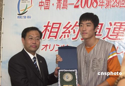 二十二日下午抵達二00四國際田聯全明星賽橫濱賽之前,匆匆途經正在橫濱中華街內舉行的“揚帆青島、相約奧運”巡回展展場,為其熱情助陣。圖為劉翔在現場接受二00八年奧運會帆船比賽賽地青島市贈送的比賽紀念牌。 作者:王健