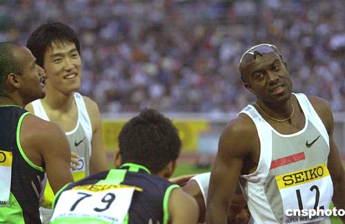 | 劉翔在二十三日傍晚于日本橫濱國際體育場進行的國際田聯(lián)全明星賽男子一百一十米欄比賽中疲憊出戰(zhàn),仍然輕松地將他的前輩老對手阿蘭·約翰遜拋到身后,令賽前揚言要破紀(jì)錄并戰(zhàn)勝劉翔的約翰遜無話可說。圖為兩位新老名將沖線后都是一臉笑容,但顯然,劉翔笑得愉快,約翰遜笑得無奈。中新社記者:王健