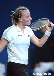 九月二十三日晚在北京舉行的首屆中國(guó)網(wǎng)球公開賽WTA巡回賽女單比賽中,新科美網(wǎng)冠軍庫茲涅佐娃經(jīng)過三盤苦戰(zhàn),險(xiǎn)勝中國(guó)選手李娜后,欣喜不已。作者:武仲林