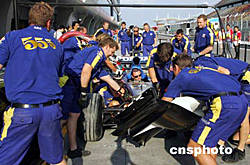 九月二十六日F1中國大獎賽將在上海國際賽車場舉行。連日來,參賽車隊積極做好各項充分準備。圖為英美車隊加緊練習如何快速維修賽車。作者:潘索菲
