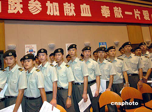 據香港中通社報道,今天上午,來自陸、海、空三軍的四百名官兵精神抖擻,以獻血這種方式,表達對香港市民的愛心。駐港部隊司令員王繼堂視察了獻血活動。他說,駐港部隊官兵參加這一活動,是對香港市民、香港社會的貢獻,用這種行動贏得香港市民、香港社會的了解,也是展示駐港部隊“文明之師,威武之師”的機會,有利于進一步增進駐軍與香港市民、香港社會的溝通,加深市民對駐軍的了解。