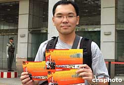 第一位領(lǐng)取參觀票的歐陽先生二十五日晚八時(shí)許就開始排隊(duì),他準(zhǔn)備和父母一起去參觀。作者:梁永強(qiáng)
