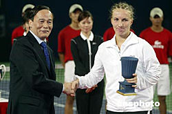 九月二十六日晚,中國(guó)網(wǎng)球公開賽女子單打決賽在北京網(wǎng)球中心中央球場(chǎng)進(jìn)行,美網(wǎng)新后、俄羅斯名將庫茲涅佐娃一比二不敵賽會(huì)頭號(hào)種子選手、美國(guó)網(wǎng)壇名將小威廉姆斯,屈居亞軍。圖為比賽結(jié)束后北京市長(zhǎng)王岐山(左)為庫茲涅佐娃頒發(fā)亞軍獎(jiǎng)杯。中新社記者:盛佳鵬