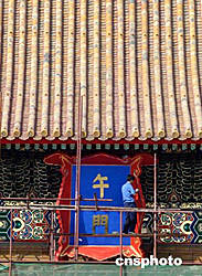 九月末,一名工人正在高高的北京故宮午門匾額處進(jìn)行維修。北京故宮正在進(jìn)行自建成以來最大規(guī)模的修繕,到2005年10月之前將完成第一階段的大修,主要進(jìn)行午門、欽安殿和中軸線周圍廡房的維修。故宮大修工程將于2020年全部完成。對(duì)正在進(jìn)行的故宮修繕工程質(zhì)量,各方人士莫衷一是。中新社記者:張煒