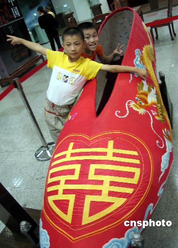 | 江蘇鎮(zhèn)江市的兩名兒童與一只世界最大的繡花鞋合影。據(jù)介紹,這只在當(dāng)?shù)厣虡I(yè)城展出的繡花鞋全長2.8米,寬0.87米,高0.71米,重達63公斤,鞋內(nèi)可躺臥兩至三人,是由溫州7名著名手工藝專家用半年多時間精心制作而成,共耗去1公斤多真絲彩線,五匹布,及100多公斤有關(guān)材料。鞋面繡有大大的雙喜字、兩側(cè)繡有龍鳳圖案,繡面光亮,紋理分明,色彩鮮艷。作者:陳崗