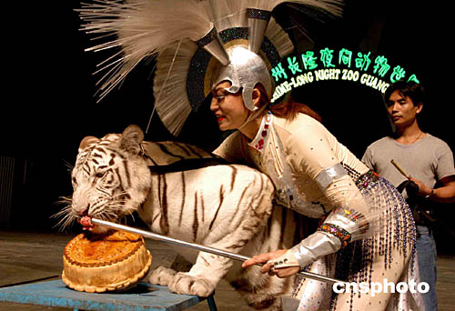 九月二十七日,廣州長隆夜間動物世界的動物提前過了一個妙趣橫生的中秋節(jié)。威猛的白老虎守著專門為它制作的大月餅大快朵頤。作者:劉衛(wèi)勇