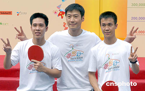 歌星黎明(中)與奧運(yùn)乒乓球男子雙打銀牌得主高禮澤(左)、李靜9月28日在香港出席「公益金便服日」突破紀(jì)錄儀式,大會并舉行乒乓球友賽,賽后黎明與香港「乒乓孖寶」合照。