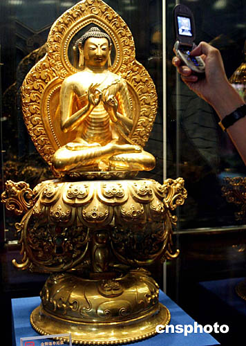 | 珍寶館是北京故宮博物院重要的常規(guī)陳列之一,以鐘表館一道以展示最具清代宮廷韻味的文物珍品為主。改陳后的珍寶館以保護(hù)文物、突出文物、盡量體現(xiàn)文物的自身價(jià)值及審美價(jià)值為原則,在整體環(huán)境設(shè)計(jì)上,以乾隆時(shí)期為依據(jù)。圖中展出的是金釋迦牟尼像。中新社記者:張勤