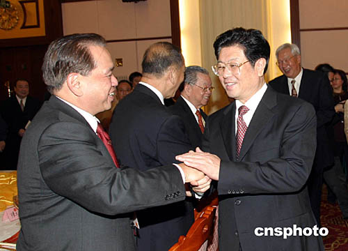 中共中央政治局委員、全國人大副委員長王兆國、全國政協(xié)副主席羅豪才會見來北京參加國慶五十五周年慶;顒拥暮M馊A僑華人。