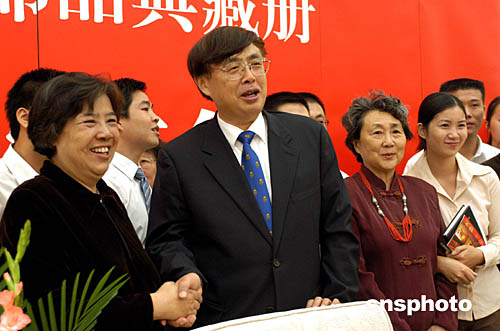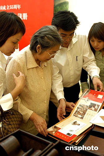 在慶祝中華人民共和國(guó)成立五十五周年之際,毛澤東的女兒李敏(左二)及孔繼寧(李敏之子)(左三)、孔東梅(李敏之女)(左一),九月二十九日以開(kāi)國(guó)元?jiǎng)子H屬和嘉賓身份,在北京人民大會(huì)堂出席《開(kāi)國(guó)元?jiǎng)住方疸y郵品典藏冊(cè)首發(fā)式和新聞發(fā)布會(huì),并一起欣賞這部由中國(guó)郵票博物館出版發(fā)行的典藏冊(cè)。