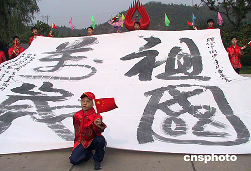 在中華人民共和國(guó)成立五十五周年到來(lái)之際,一位名叫陳鼎新的上海十歲學(xué)童(前),九月二十九日在北京八達(dá)嶺長(zhǎng)城把自己書(shū)寫(xiě)的一幅巨筆書(shū)法作品捐獻(xiàn)給“中國(guó)少年兒童基金會(huì)”,以表達(dá)對(duì)祖國(guó)的祝福。作者:宗金柱