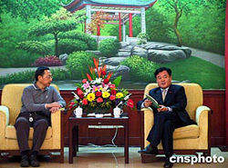 湖南省副省長賀同新(右)九月三十日在長沙會見全國政協(xié)委員、香港興業(yè)集團董事會副主席查懋聲一行。查懋聲來湘是為了考察湖南株洲市一個總投資額近七億元的房地產(chǎn)項目。作者:鄧霞