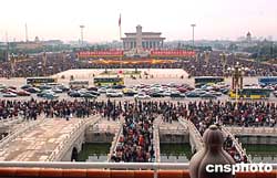 十月二日的國慶節(jié)假日,天安門廣場向北京市民來賓開放,數(shù)十萬游人,紛至沓來,從各個(gè)通道擁進(jìn)廣場觀光,形成節(jié)日人山人海的景觀。作者:鄒憲