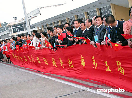 十月六日傍晚,中國總理溫家寶抵達(dá)河內(nèi)開始對越南正式訪問。中國駐越使館工作人員、華僑、留學(xué)生手持國旗,打出橫幅熱烈歡迎溫家寶總理訪問越南。作者:吳慶才