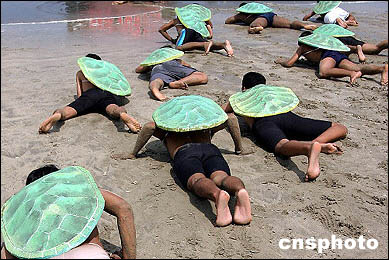 在一次保護(hù)當(dāng)?shù)厣鷳B(tài)環(huán)境的抗議活動中,動物權(quán)利保護(hù)組織成員裝成海龜,在巴厘島的庫他海灘上爬行。