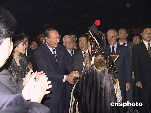 法蘭西共和國(guó)總統(tǒng)雅克·希拉克一行于八日晚22時(shí)抵達(dá)訪(fǎng)華首站--四川省成都市,在雙流國(guó)際機(jī)場(chǎng),受到了中國(guó)國(guó)家副主席曾慶紅、中共四川省委書(shū)記張學(xué)忠等官員和各界人士的熱烈歡迎。對(duì)川劇界人士表演的變臉等川劇絕活,希拉克總統(tǒng)興味甚濃,頻頻停下腳步與他們交談。作者:楊杰