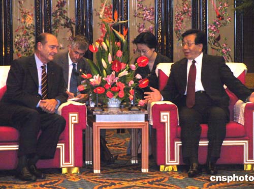 中國(guó)國(guó)家副主席曾慶紅(右)10月9日在四川成都錦江賓館會(huì)見了來(lái)華訪問(wèn)的法蘭西共和國(guó)總統(tǒng)雅克·希拉克(左)一行,雙方進(jìn)行了親切友好的交談。作者:楊杰