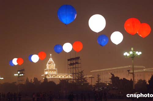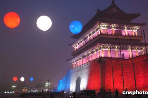 正當法蘭西共和國總統(tǒng)希拉克對中國進行國事訪問之際,及中法文化年將進入第二個階段——中國舉辦“法國文化年”一系列活動之時,十月九日下午六時許,北京天安們廣場南側(cè)正陽門樓披上象征法國國旗紅白蘭三色艷麗燈光,八組二十四盞千瓦紅白蘭燈光彩色氣球環(huán)繞天安門廣場,營造出一派中法友誼歡樂景象。在十月十日,法國文化年將在中國將正式拉開帷幕。作者:鄒憲