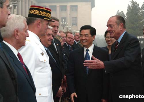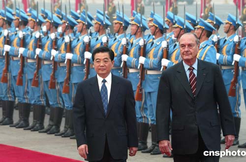 中國(guó)國(guó)家主席胡錦濤十月九日在北京舉行儀式,歡迎法國(guó)總統(tǒng)希拉克訪華。中新社記者:滿會(huì)喬