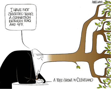 | 中新網(wǎng)10月10日電 10月5日,在美國(guó)俄亥俄州的克利夫蘭市,現(xiàn)任副總統(tǒng)切尼與民主黨人愛(ài)德華茲進(jìn)行了一場(chǎng)激烈辯論。在唇槍舌劍的過(guò)程中,切尼公然聲稱,他從未說(shuō)過(guò)伊拉克與911事件有關(guān)——事實(shí)上,認(rèn)為伊拉克與911事件存在聯(lián)系是切尼這幾年一直掛在嘴邊的說(shuō)辭。童話中曾說(shuō),撒謊的人會(huì)長(zhǎng)出大鼻子。(來(lái)源:法國(guó)際報(bào)刊)