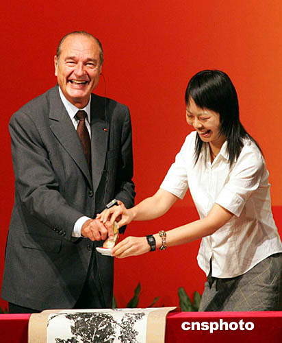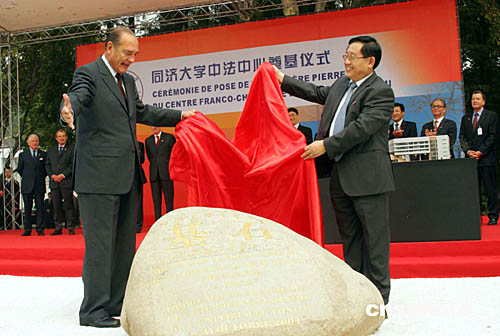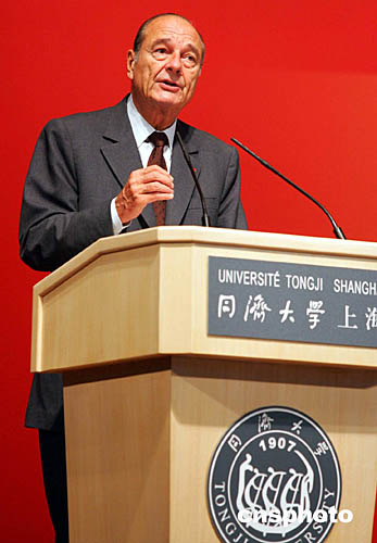 素有“中國(guó)情結(jié)”的法國(guó)總統(tǒng)希拉克今天一到上海就來(lái)到著名高等學(xué)府同濟(jì)大學(xué),向全中國(guó)青年滿懷感情地表達(dá)來(lái)自法國(guó)的友誼與共同接受新世紀(jì)挑戰(zhàn)的美好愿望,并接受了中國(guó)學(xué)子寓意中法友誼長(zhǎng)存的禮物。