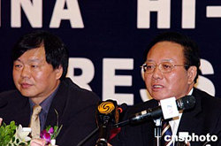 十月十一日下午,第六屆中國國際高新技術(shù)成果交易會組委會向媒體記者發(fā)布信息,有來自加拿大、俄羅斯、美國、德國、韓國等二十一個(gè)國家和國際組織組團(tuán)參加本次盛會。圖為商務(wù)部副部長魏建國(右)信息產(chǎn)業(yè)部副部長婁勤儉向記者發(fā)布“高交會”信息。作者:陳文