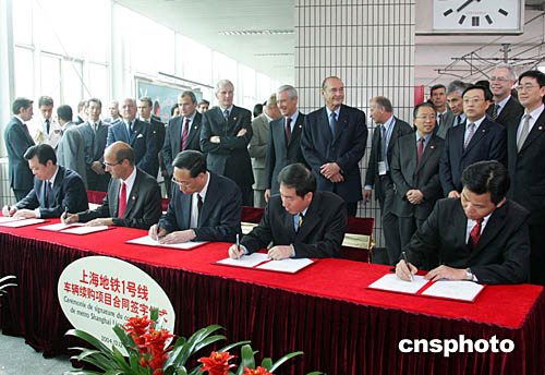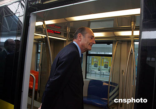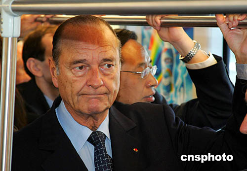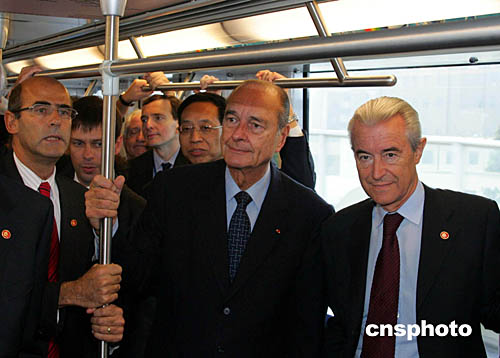 十月十二日,法國總統(tǒng)希拉克參觀、乘坐上海軌道交通三號(hào)線,并見證“上海地鐵一號(hào)線車輛續(xù)購項(xiàng)目合同簽字儀式”。上海申通集團(tuán)有限公司將購置一百二十八輛中法合作生產(chǎn)的地鐵車輛,二十二個(gè)月后這些車輛將陸續(xù)投入營運(yùn)。作者:潘索菲