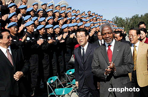正在北京訪問的聯(lián)合國秘書長安南,十月十二日參觀公安部維和中心。中新社記者:毛建軍