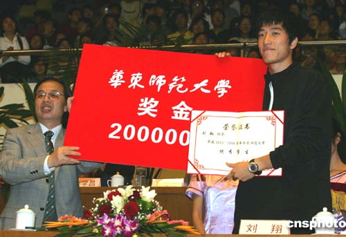 已成為世界級(jí)體育明星的劉翔目前仍是上海華東師范大學(xué)法政學(xué)院二○○一級(jí)本科在讀生。今天正值學(xué)校五十三周年校慶,又是本年度推薦免試直升研究生資格的最后一天,劉翔在指導(dǎo)教練孫海平的陪伴下簽署了相關(guān)文件。