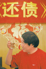 10日晚上,《還債》劇組舉行了開機宴,由于高速公路起霧,牛群從北京趕到石家莊的時候已經(jīng)是晚上8點鐘。當(dāng)牛群一臉疲憊地出現(xiàn)的時候,他那已經(jīng)成為“攝影師、平民縣長”標(biāo)志的馬甲并沒有穿在身上,而只穿了件紅色T恤和一件運動外套。讓記者感到第二個變化的是牛群的話少了,開機宴上男主角牛群自然少不了講話,人們滿懷期待他能夠講出如相聲般的精彩話語,可牛群只說了兩句客套話便沒了下文,在給各桌敬酒的時候他的話更少,只是端一下酒杯而不開口。