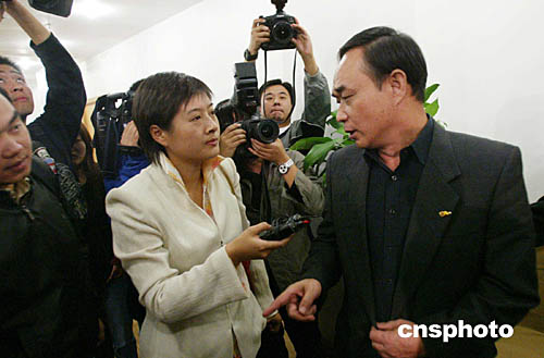 圖為中超委員會秘書長郎效農(nóng)(右)在新聞發(fā)布會后被媒體包圍。