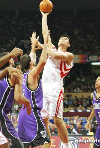 十月十四日晚,首屆NBA中國(guó)賽在上海開(kāi)賽。在數(shù)萬(wàn)名球迷的擁戴下,小巨人姚明在家鄉(xiāng)“主場(chǎng)”迎戰(zhàn)國(guó)王隊(duì)。最終火箭隊(duì)以八十八比八十六險(xiǎn)勝國(guó)王。作者:湯彥俊