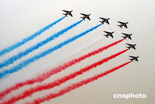 法國空軍“法蘭西巡邏兵”是當今世界著名的五大特技飛行表演隊之一,與英國的“紅箭”、意大利的“三色箭”并稱為“歐洲三杰”。本次該飛行表演隊隨法國總統(tǒng)希拉克首次來華訪問,作為在中國舉辦的法國文化年重要活動內(nèi)容之一,定在北京、武漢、香港和珠海四個城市進行飛行表演。此前,飽受天氣困擾的“法蘭西巡邏兵”直至本月十一日才在北京進行首演。