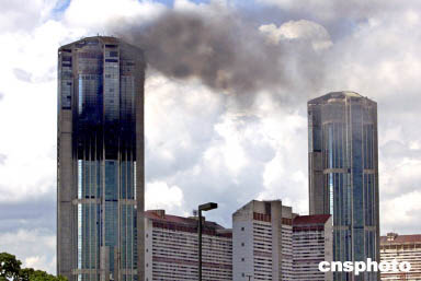 10月17日,委內(nèi)瑞拉首都加拉加斯的雙子塔東樓冒著滾滾的濃煙,著起了熊熊大火。