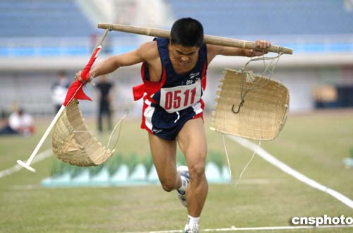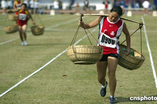 具有濃郁農(nóng)村特色的挑搬糧食比賽成為賽場上亮點(diǎn),參賽選手在比賽中不僅要有速度,還要有力量和平衡感。圖為女子八十米挑搬糧食比賽。中新社記者:盛佳鵬