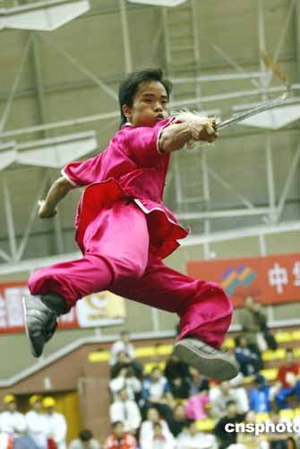 在男子劍術(shù)的比賽中,精彩場面不斷,圖為一名參賽選手在比賽中凌空攻擊,如同小說中的俠客。中新社記者:盛佳鵬