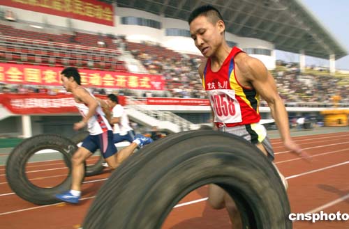 特色十足的一百米推輪胎比賽將速度與技巧結(jié)合在一起,成為賽場上的一個(gè)亮點(diǎn)。圖為參賽選手在男子一百米推輪胎比賽中奮勇爭先。中新社記者:盛佳鵬