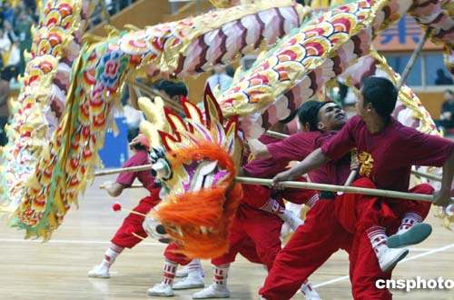 在舞龍比賽自選套路的比賽中,貴州隊(duì)表演了高難度舞龍動作。中新社記者:盛佳鵬