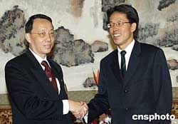十月二十一日,國(guó)務(wù)院港澳辦副主任張曉明(右)在北京國(guó)賓館會(huì)見(jiàn)了由陳景生率領(lǐng)的香港大律師工會(huì)訪(fǎng)華團(tuán)。作者:史利