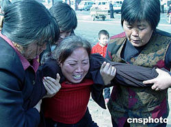 據(jù)國家安監(jiān)局網(wǎng)站消息,河南省鄭州煤電(集團)有限責任公司大平煤礦二十日二十二時十分發(fā)生的瓦斯突出事故截止25日20:30已找到122名遇難者,仍有26人被困于井下。救援工作仍在進行之中。圖為在礦難現(xiàn)場外悲痛欲絕的大平礦難家屬。作者:王迪