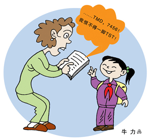 家住天津市和平區(qū)的許女士無(wú)意間發(fā)現(xiàn)女兒的日記中有這樣的文字:“……沒(méi)想到我最要好的朋友竟欺騙我,TMD(他媽的),7456(氣死我了),我恨不得一腳TST(踢死她)。”許女士看后不知所云,直到女兒一番解釋她才明白過(guò)來(lái)。許女士無(wú)奈地對(duì)記者說(shuō):“這是什么話呀,日記本成了密碼本,根本看不明白!看來(lái)我和孩子之間已經(jīng)有了‘網(wǎng)絡(luò)溝’!