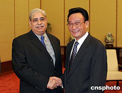 中新社北京十月二十七日電(記者 朱大強(qiáng))中國(guó)全國(guó)人大常委會(huì)委員長(zhǎng)吳邦國(guó)今天在人民大會(huì)堂會(huì)見了來訪的巴基斯坦國(guó)民議會(huì)議長(zhǎng)喬杜里·侯賽因一行。