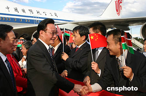 中新社內(nèi)羅畢十月二十九日電(記者張量)當?shù)貢r間二十九日下午,中國全國人大常委會委員長吳邦國抵達內(nèi)羅畢國際機場,開始對肯尼亞為期四天的正式友好訪問。