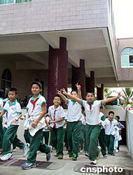 今天上午九時(shí)正,“嗚嗚嗚”的預(yù)先警報(bào)聲在海口市區(qū)上空鳴響。九時(shí)二分左右,記者看到海南省政府辦公駐地附近的英才小學(xué)近五百名學(xué)生,在老師們的緊張指揮下跑步快速撤離校區(qū)。孩子們踏起的沙塵灰土四處彌漫。