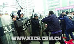 20余人聚集在某市市政府前“鬧事”,110民警迅速趕到現(xiàn)場(chǎng)設(shè)立警戒線,阻止“鬧事者”的前進(jìn)。但情緒激動(dòng)的“鬧事者”很快便沖破了第一道防線,開(kāi)始?xì)蛎窬。接?bào)趕到的防暴大隊(duì)特警手持防暴盾牌進(jìn)行攔截,設(shè)置了第二道防線。為了迅速平息大規(guī)模的“騷亂事件”,上級(jí)命令使用催淚彈等對(duì)“鬧事人群”進(jìn)行驅(qū)散。幾顆催淚彈丟在地上,散出滾滾濃煙。當(dāng)特警采取防暴隊(duì)形圍捕了為首的“鬧事者”后,其余人便立即作鳥(niǎo)獸散去,“危機(jī)”終于化解。