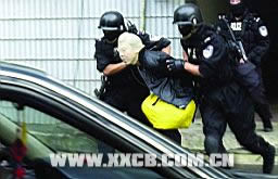 “我要裝滿油的汽車(chē),把我送到安全地點(diǎn)!”“歹徒”用槍抵住“人質(zhì)”的頭,跑上三樓,從窗戶內(nèi)探出身子大叫:“不然我殺了他!”追捕小組一邊穩(wěn)定其情緒,一邊針對(duì)現(xiàn)場(chǎng)情況制定了強(qiáng)攻方案。3名特警從5樓貼墻緩緩而下,此時(shí)“歹徒”叫囂就要對(duì)“人質(zhì)”下手,中間的特警看準(zhǔn)時(shí)機(jī),開(kāi)槍擊斃了一名還在叫囂的“歹徒”。兩旁的特警乘機(jī)跳入房間,將另一名“歹徒”控制住。戰(zhàn)斗結(jié)束,“歹徒”一死一捕,“人質(zhì)”被安全救出。