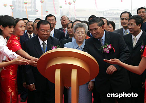 圖為中國國務院副總理吳儀、柬埔寨首相洪森和老撾總理本揚等,在開幕式上共同啟動世紀時鐘。
